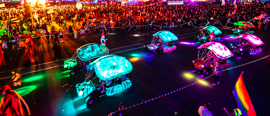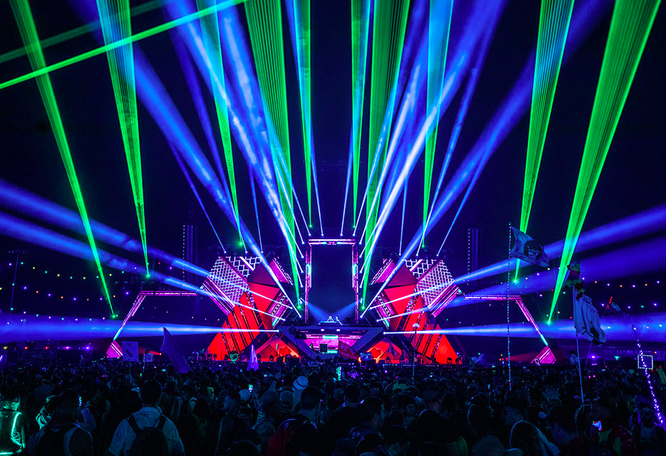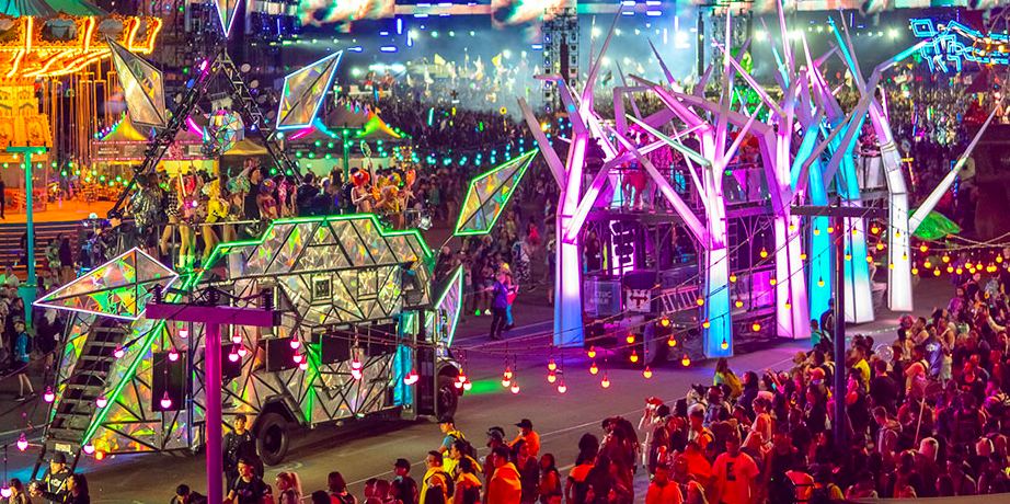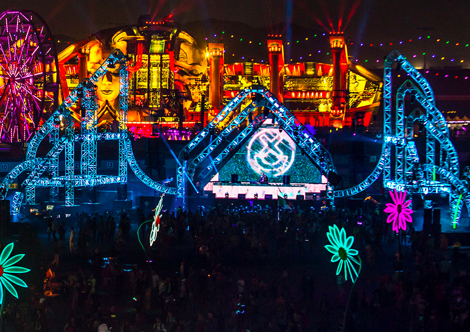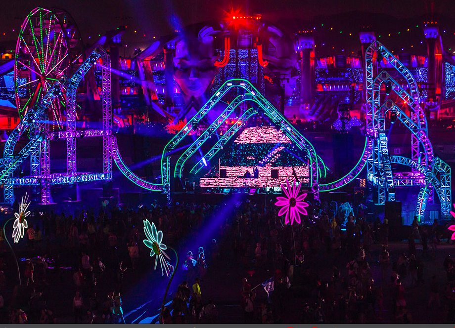 EDC overall is equipt with 8 extravagent stages, and multiple art cars. Insomniac puts immense hard work into its stages to create beautiful megastructures for all to see. EDC’s main stage, Kinetic Field, has taken on many artistic forms. From a large majestic owl that blinks along to the music to two humans holding up a beautiful laced heart to most recently two women’s heads with their eyes closed and hands placed together at peace. This stage has featured legends such as TIËSTO, Timmy Trumpet, Zedd, Deorro, and more.