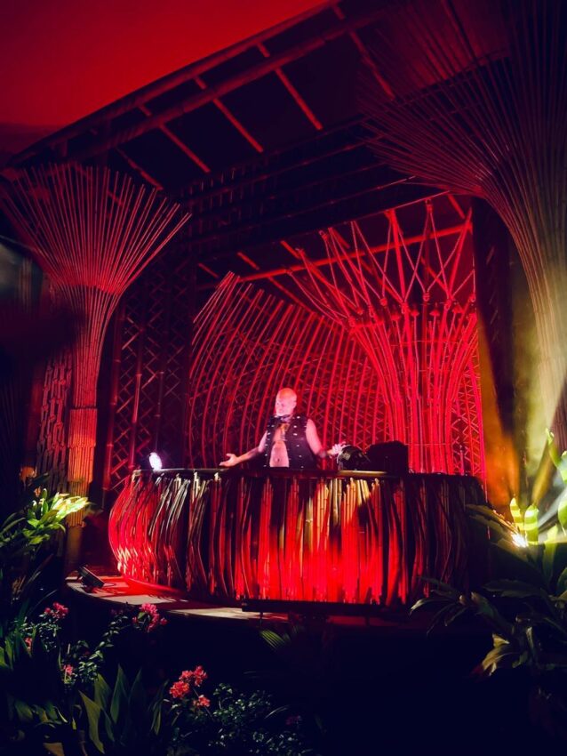 Saturday night at Bambú belonged to Funka and Antaares. Costa Rican producer Funka opened the portal with wobbly basslines that rolled through the bamboo pillars while spoken-word samples like Edgar Allan Poe’s The Raven drifted through the humid night air. His distorted live vocals slithered through the mix like ghosts wandering through a swamp of subwoofers. Mexican producer Antaares followed with a hypnotic run of mostly original tracks, locking the dancefloor into a deep rhythmic pocket that kept the crowd swaying well past midnight.