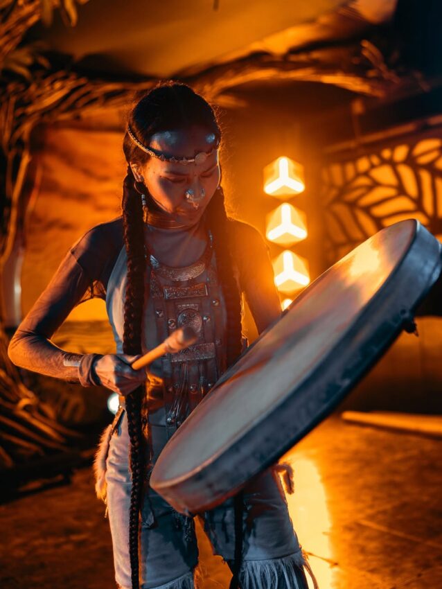 Siberian Indigenous vocalist and multi-instrumentalist Snow Raven perched on the Village Stage like the embodiment of an animal spirit, her set decorated with a constellation of instruments surrounding her singular and tribal voice. Bird calls, animal cries, haunting harmonics, and stories of her ancestors drawn from her Arctic homeland held the crowd in a deep trance. The first rows sat cross-legged near the stage while the rest of the audience packed closely behind them, forming a spontaneous mini-amphitheater beneath the trees. In an invitation to participate, the crowd echoed her calls back into the night, turning the clearing into a chorus of human and animal voices.