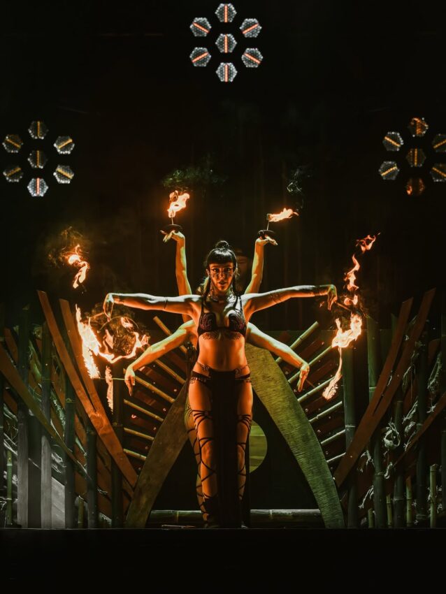 Another highlight throughout the week came from the aerialists, dancers, and fire performers appearing both during and between sets at the Luna Stage. Silks twisted high above while fire dancers carved glowing spirals into the jungle night. Performers emerged from behind the veil and transformed transitions into their own spectacle. Massive head nod to the aerialist hanging from his hair in the lotus position while rotating and fire spinning. From The Awa Experience to Circus With Purpose, from Pyrodanza to Synapse Circus, their appearances created mesmerizing micro-performances scattered throughout the night.