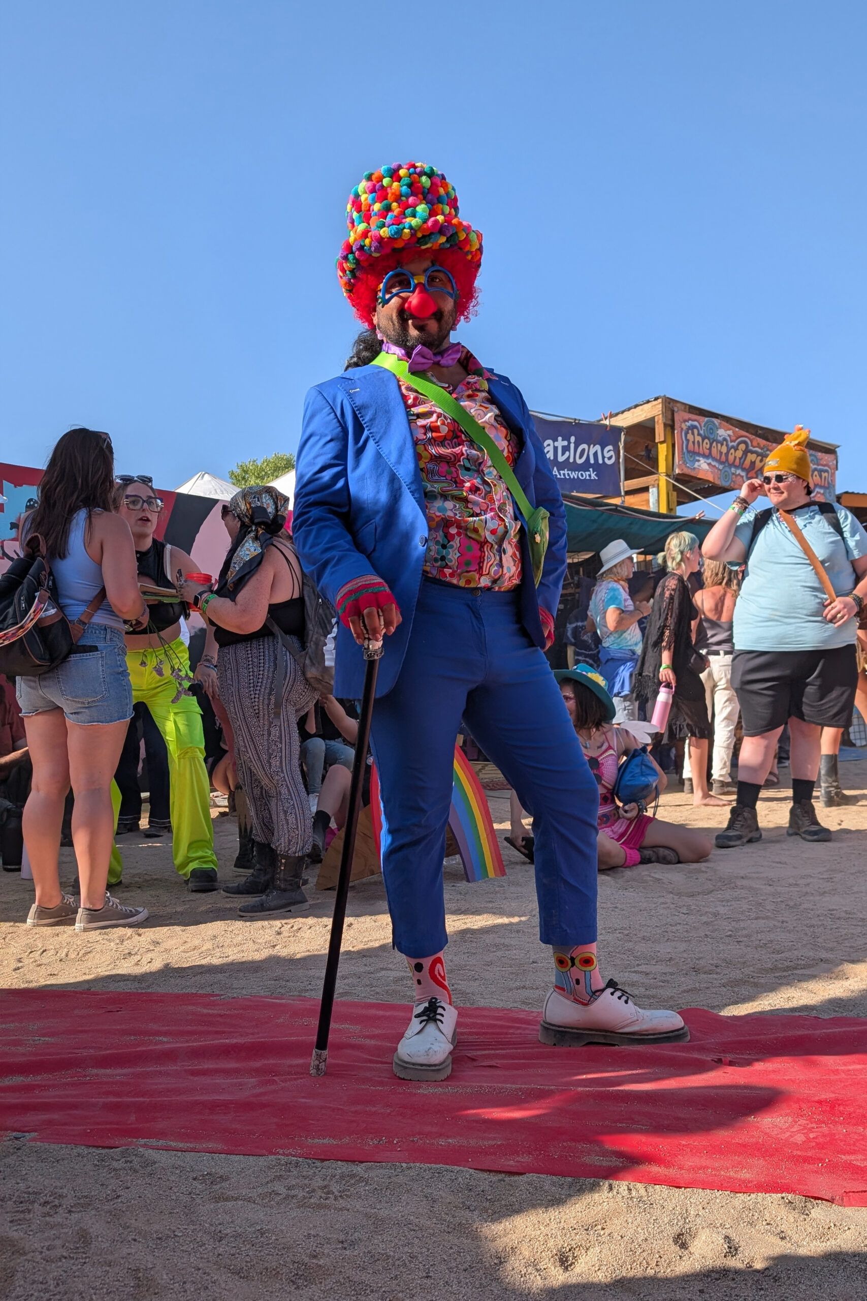 Just when we thought the festival was over and it was time to return to the default world, we serendipitously stumbled upon the Veggie Camp where the afterparty was going strong. We were drawn to a glowing beacon: Spike the Clown inviting us to play the Mouse Trap Tower Game, accentuated by his lovely & impossibly charismatic partner Rainbow Sparks who danced like a trickster around the board.