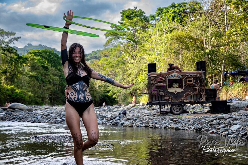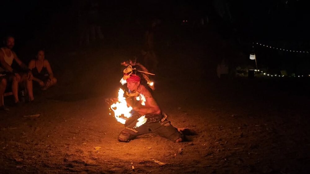 A couple days later, we saw a man on the roadside with gear and a long fire staff that made his destination obvious. This time we stopped. He was a tico — a local — a fire performer, and jewelry artist, grateful and effortlessly present. He told us he performed with a skull on his face, and we immediately recognized him from Envision — the dancer with flickering flames wrapping around the broken bones he collected from these hallowed grounds and repurposed into a mask, his body bending through the heat, and his eyes locked in a trance-inducing stare. Later that night, we found him again before he stepped into the flame like a moving ignition point in the dark. The universe had offered a redo and waited to see if we’d take it.