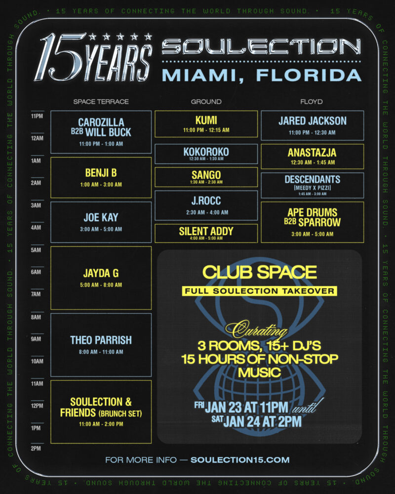 Fifteen years, fifteen hours, three rooms—SOULECTION is curating a soul shakedown at Club Space Miami from tomorrow night, starting at 11:00 PM until 2pm Saturday afternoon, and here are the set times, an exclusive lineup playlist and some words to keep you in the know when your friends ask, “who is this!?”